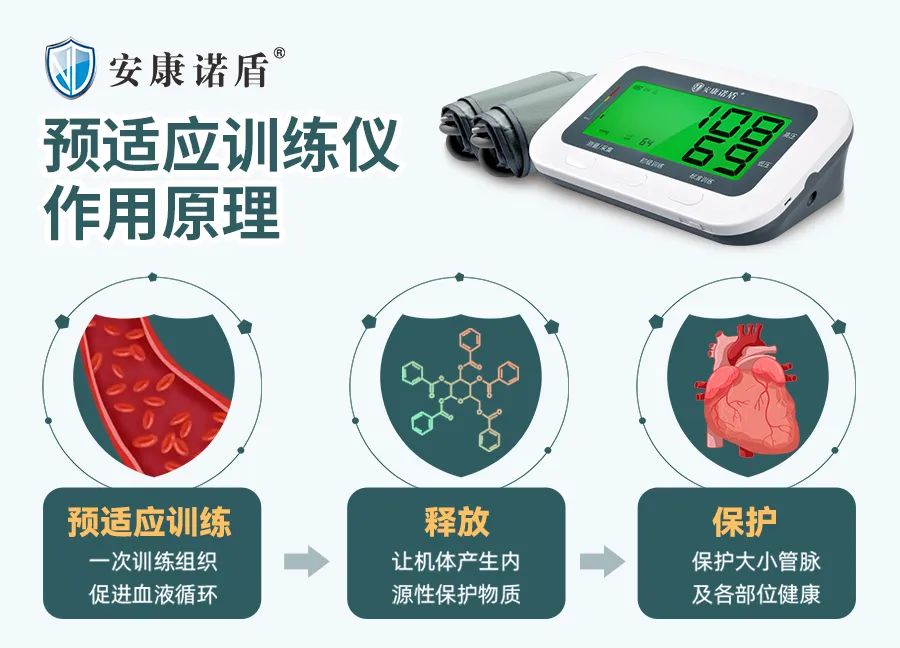而安康諾盾缺血預(yù)適應(yīng)訓(xùn)練儀可通過(guò)經(jīng)常對(duì)人體進(jìn)行反復(fù)的、短暫的、無(wú)創(chuàng)傷、無(wú)危害的缺血預(yù)適應(yīng)訓(xùn)練,激發(fā)人體免疫系統(tǒng)的應(yīng)急機(jī)制,從而達(dá)到預(yù)防心腦血管等疾病的發(fā)生。