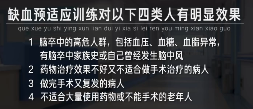 他表示,缺血預(yù)適應(yīng)的訓(xùn)練,主要是用于心腦卒中的預(yù)防和治療,經(jīng)臨床結(jié)果表明,對這四類人群有顯著的效果。